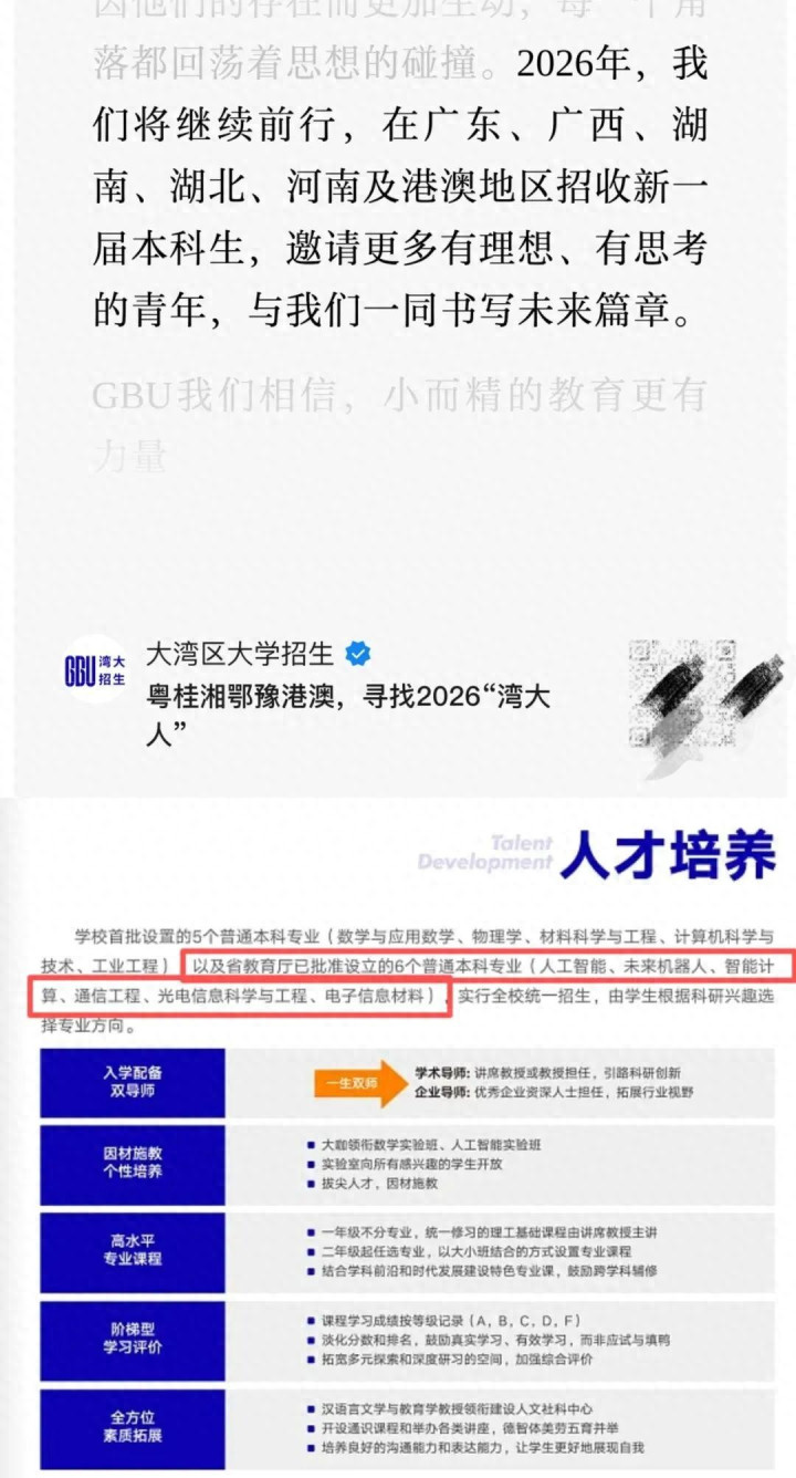近日,大湾区大学官方发布消息:2026年,将在广东、广西、湖南、湖北、河南及港澳地区招收新一届本科生。并且在数学与应用数学、物理学、材料科学与工程、计算机科学与技术、工业工程基础上,广东省教育厅已批准设立人工智能、未来机器人、智能计算、通信工程、光电信息科学与工程、电子信息材料等6个本科专业。